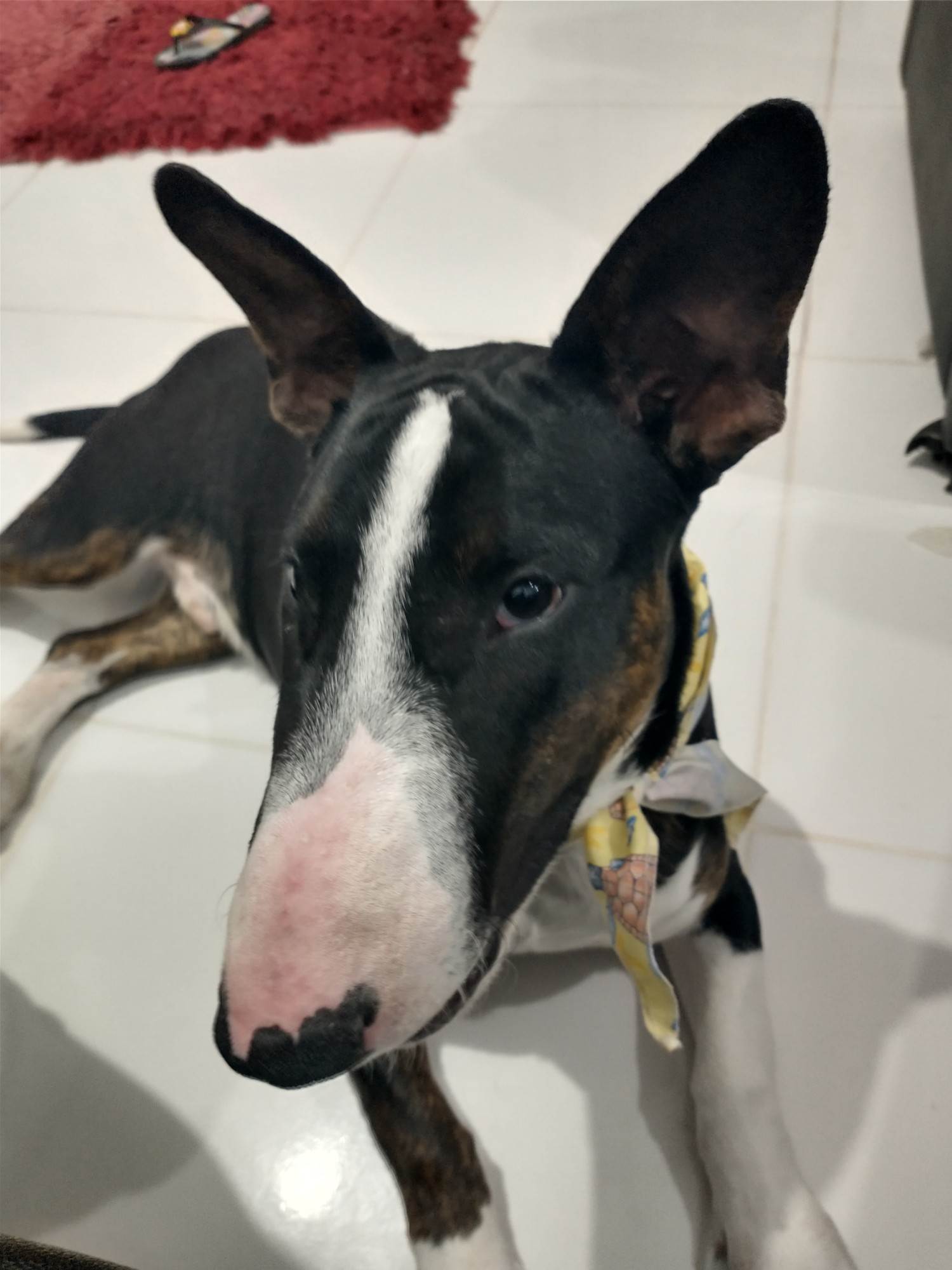 Cachorro médio, 4 anos, Bull Terrier, cor Preta/Marrom.
